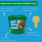 Airway Plus helps to keep chests clear, soothe throats and irritation. This premium breathing supplement maintains mucus levels and bacterial balance. AirwayPlus supports normal breathing and the respiratory system in challenging and dusty conditions throughout the winter and offers routine support in the summer. Fast and effective results.