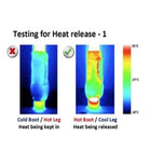 Research has shown that when tendon cells are heated to 48°C for 10 minutes approx, 80% of them die. We use several different methods to assess heat release from boots. The heat release is estimated by fitting the boots to a metal flask containing water at 45°C in a room at 20°C with no significant radiation. The surface temperature of the boots is measured using a thermal camera. We tested Tri-Zone boots, along with a number of other boots on the market.