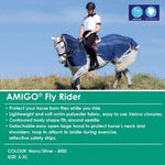 This lightweight rug is contoured to fit around your saddle without interfering with your leg aid positioning. It covers your horse from top to tail in a UV protective breathable fly-relief fabric, with easy-to-use Velcro closures for a secure fit. The Amigo® Flyrider has a detachable 'easy fix' hood that protects your horse's neck and shoulders, and an integrated loop attaches to the bridle during exercise. To the back, a generous flap covers your horse's tail with a tail strap and reflective safety strips and trim throughout. The high vis colourway makes this an excellent choice for visibility. A superb addition to our extensive range of fly rugs and a brilliant addition for insect protection under saddle.