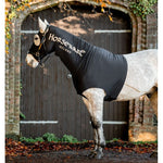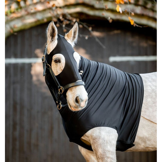 The hood style includes face, neck, and shoulder coverage with easy zip and Velcro covers, while the Slinky full body rug offers face, neck, belly and hind leg coverage with easy zip and Velcro closures and front and back leg arches. The premium Lycra fabric offers a four-way stretch for freedom of movement, and the face, neck, lower chest and belly flap are secured by the sturdy covered zip closures with the hind leg covers secured with Velcro closures.