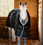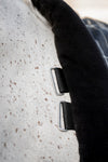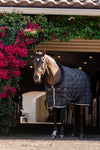 The 1000D polypropylene outer in our classic cut design with double front closures offers a secure fit. A cozy fleece shawl collar with integrated, cushioned wither pad lifts the rug to sit gently on your horse's mane and sensitive wither area, helping to prevent rubs and pressure points.