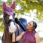Decrease sharp sounds and improve your horse's relaxation and concentration with this peak-performance Acoustic Fly Hood. Hand crocheted in a specialist patterned knit, it has a sporty low-line cut. Coordinated soft shell patch trim and matte silicone LeMieux branding create a sophisticated look.