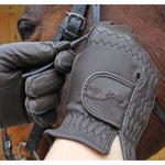 Quality leather gloves featuring elasticated wrist, hook and loop fastening tab with branded embroidery, ventilation holes along the finger and reinforced rein fingers.