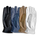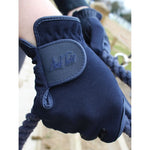 Smart faux leather gloves with pitted effect insert and knitted back, featuring an elasticated wrist and tab fastener with branded embroidery.