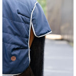 A luxuriously padded fleece collar in stylish Newmarket stripe prevents drafts in colder weather and sits comfortably around the neck. V-Front Closure, cross surcingles, and tail string keep stable rug securely in place while giving your horse the freedom of movement they want in a stable rug to move and lay down comfortably.