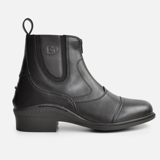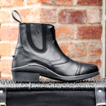 A sporty ladies paddock boot that's durable enough for everyday riding and yard work and is still extremely comfortable due to the shock absorbing sole and flexible easy-care leather upper. Soft and flexible easy-care synthetic leather is vegan-friendly and easy to clean. Features a sporty styling with stitched detail and concave toe-cap, corrosion-resistant front zip and heel puller make pulling this boot on a breeze, air-cushioned sole is shock absorbing and non-slip, elastic side panels for support with Brogini B embossing, two part spine construction for flexible comfort and a rear spur stud.