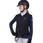 As with the other EquiAirbag® products, the release strap is clipped to the saddle. The airbag vest protects the spine and the front of the body when expanding. The built-in EquiAirbag® release system is patented and is also used in the other EquiAirbag® products.