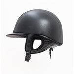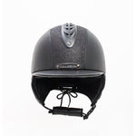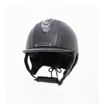 Low profile lightweight fibre glass shell with new contoured shaped peak. Highly ventilated airflow system. Synthetic leather finish with sparkle centre panel and black vent.