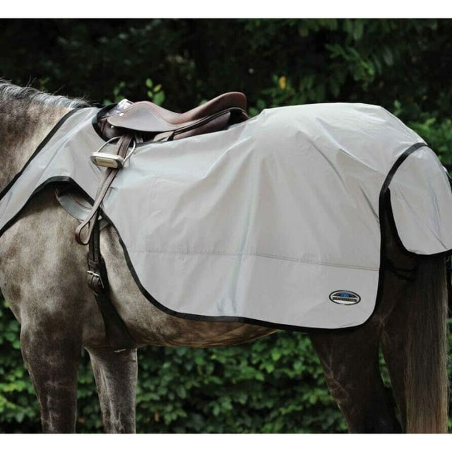 The WeatherBeeta Reflective Wrap Around Exercise Sheet is a showerproof and breathable exercise sheet with 210T polyester lining featuring all over reflective material, making it ideal for riding in poor visibility. Touch tape closures at wither and around the chest allow for an easy on/off. Tail flap and tail cord.