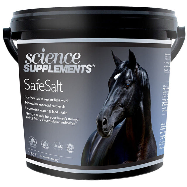 Exactly as the name suggests: Salt that is safe for your horse and their stomach. A unique electrolyte (NaCl; sodium and chloride) to overcome problems with palatability, gastric upset and gastric ulceration. Individual grains of salt coated in special oil which will not dissolve in the mouth or stomach. The oil coating dissolves in the small intestine where electrolyte uptake is optimal and gentle on the stomach unlike ordinary electrolytes
