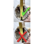 Measure the hoof length carefully just AFTER A FRESH TRIM. Do NOT include heel bulbs. Stay within the hoof size range as room growth has already been allowed for between regular trims. Please see measuring image and note that when printing the chart ensure the sizing equates to a standard ruler.