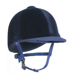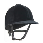 Velvet covered riding hat with a lightweight injection moulded ABS shell with three point webbing harness. Shock absorbing peak.