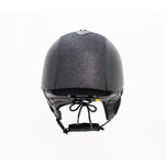 Low profile lightweight fibre glass shell with new contoured shaped peak. Highly ventilated airflow system. Synthetic leather finish with sparkle centre panel and black vent.