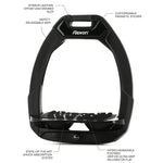 This design also helps to prevent injury, by minimising the pressure put on joints caused by the movement of your horse, thanks to the built in elastomer springs. The treads rest on the elastomer springs and are ergonomically designed with offset stirrup leather slots for a better connection to your horse and increased comfort.