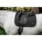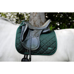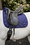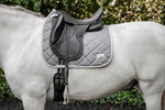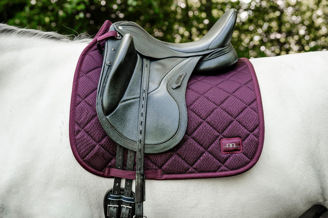 This pad features sleek luxury styling with refined gun metal AA branding. It has a satin finish on top for a high end look and highly breathable 3D spacer mesh underneath for air flow. It it lightly cushioned for comfort, with D ring tabs and girth strap to pad securely in place.