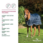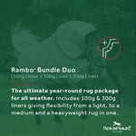 Includes 100g outer and 100g hood, 300g liner and 100g liner giving you flexibility from a light, to a medium and a heavy rug. This rug offers the ultimate in versatility, breathability and warmth. Includes other Rambo® Duo features.