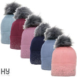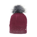A glamorous close knit bobble hat beautifully finished with a banded cluster of delicate diamantes across the front of the hat and faux fur bobble.