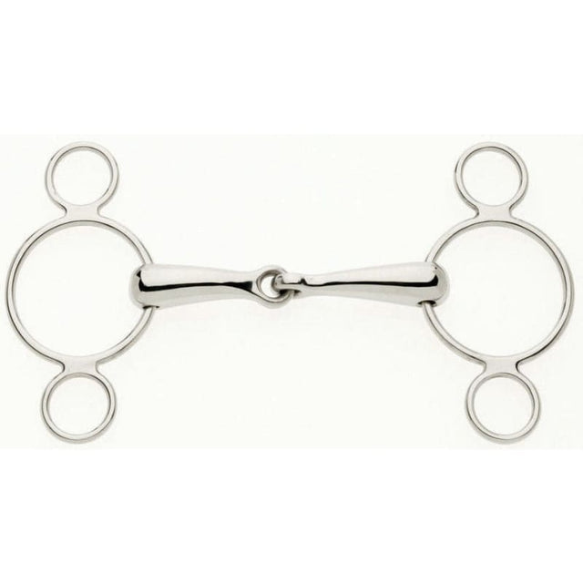 The jointed mouth gag gives a nutcracker action and has the capacity to use pressure leverage on the poll. The lower the rein, the greater the leverage.