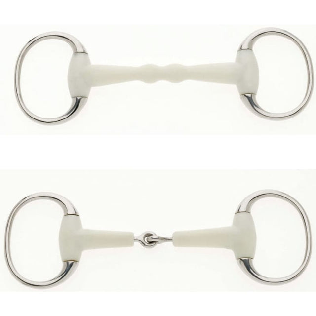 The combination of a softer material in the mouth with it's curved shape, allows the pressure on the bit to be distributed more evenly in the mouth.