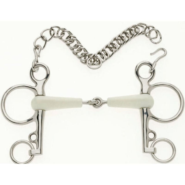 The flexi jointed mouth pelham has a single jointed mouthpiece which has a softened action due to the plastic covered mouthpiece which acts mostly on the bars and occasionally the palate of the horses mouth. The jointed mouthpiece can effect the way the curb acts and lessens the direct action of the curb, but puts slightly more pressure on the bars of the mouth and the palate. The flexi jointed pelham is useful for horses who tend to put their head down as this particular polyurethane jointed mouthpiece often has the effect of raising the horses head. Pelham bits are designed to be used with two reins, the 'snaffle' rein on the larger ring which should have a constant contact, and the curb rein is attached to the smaller loose bottom ring and is used when needed.
