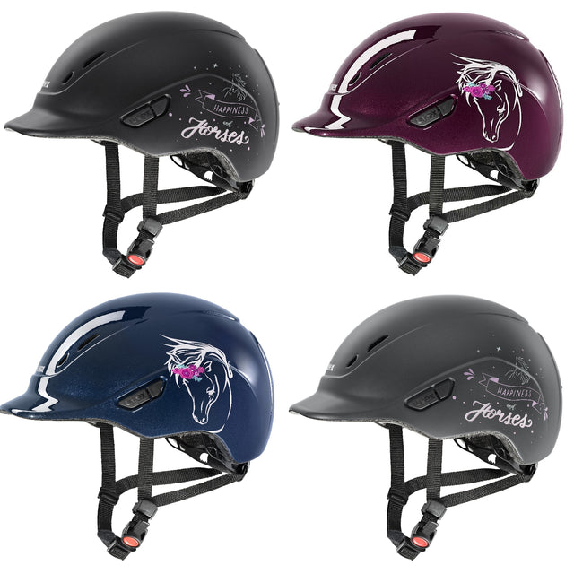 Available with a Flower design in Shiny Navy or Shiny Burgundy or Happy Horse design in Black Matt or Anthracite Matt in XXXS - S with adjustable wheel at the rear of the helmet for extra security and comfort.