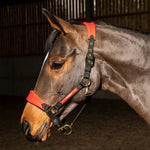 Turn heads with the Harewood Luxe Velour Headcolla - a statement piece that blends comfort with glamour. Featuring a wide velour-padded noseband and headpiece, along with elegant velour ribbon on the cheek pieces, it delivers a soft, luxurious feel your horse will love. Eye-catching gold-tone hardware adds a touch of sophistication, while the single buckle crown and adjustable chin strap ensure a secure, customized fit.